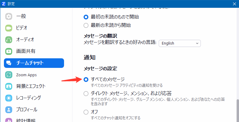 また、チャットが来た時に通知が来るように、「チームチャット」の設定で、通知を「すべてのメッセージ」にします。