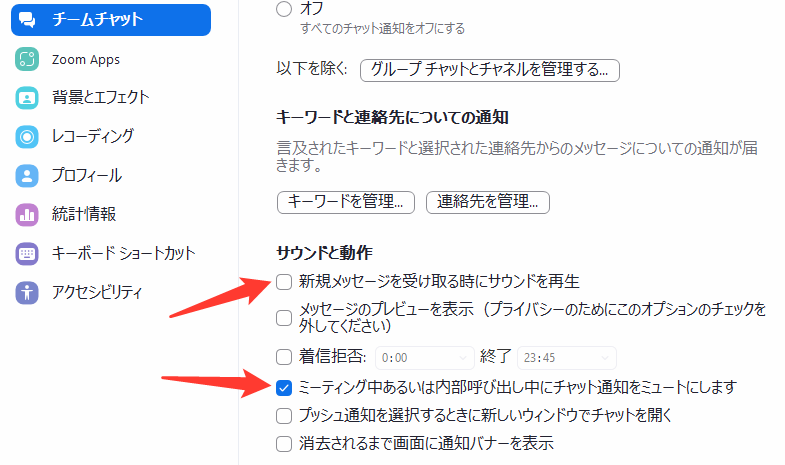 Zoomでミーティングをしているときだけ音を鳴らさないという設定にするのであれば、「ミーティング中あるいは内部呼び出し中にチェット通知をミュートにします」にチェックを付けます。