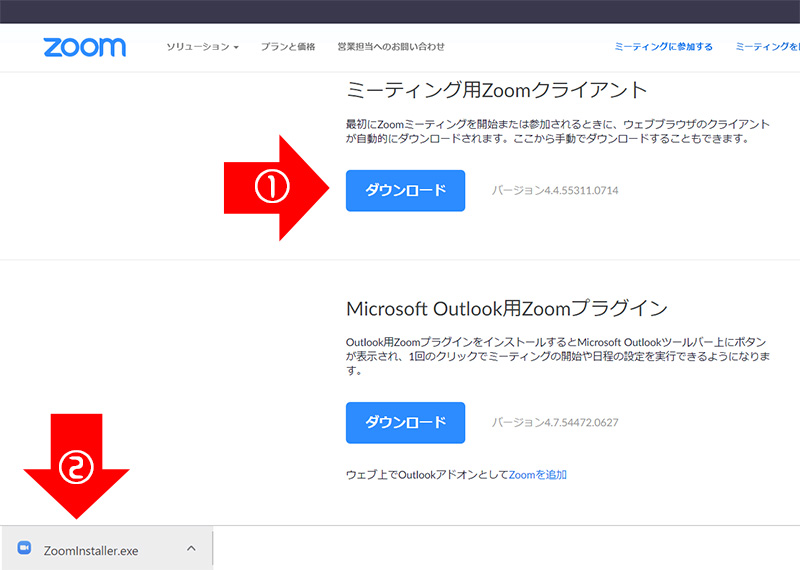 ① ミーティング用Zoomクライアントでダウンロードをクリックします。