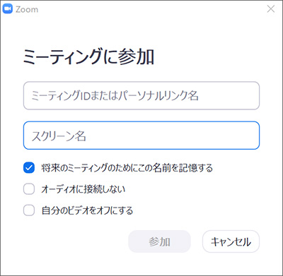 Zoomミーティングの主催者から伝えられたミーティングID と ミーティングに入ったときに表示される名前を入力します。
