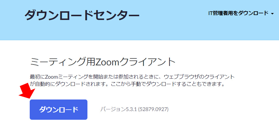 「ミーティング用Zoomクライアント」の「ダウンロード」をクリックすると、パソコンにインストール用のファイルがダウンロードされます。