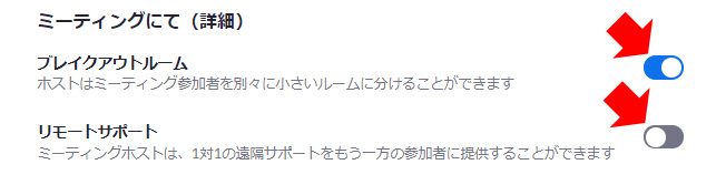 リモートサポート」がONになっている場合は、「リモートサポート」をOFFにしてから、「ブレークアウトセッション」をONにしてください。