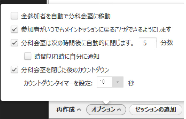 ブレークアウトセッションでは、オプションを設定することにより、更にスムーズなブレークアウトセッションが実現できます。