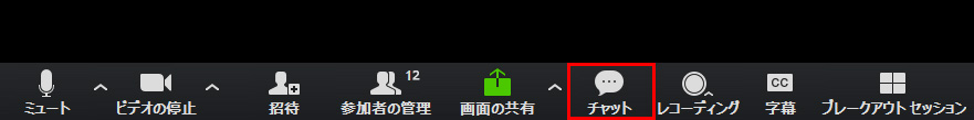 ミーティングの中で、文字によるメッセージのやり取りをしたいときには、「チャット」ボタンをクリックします。