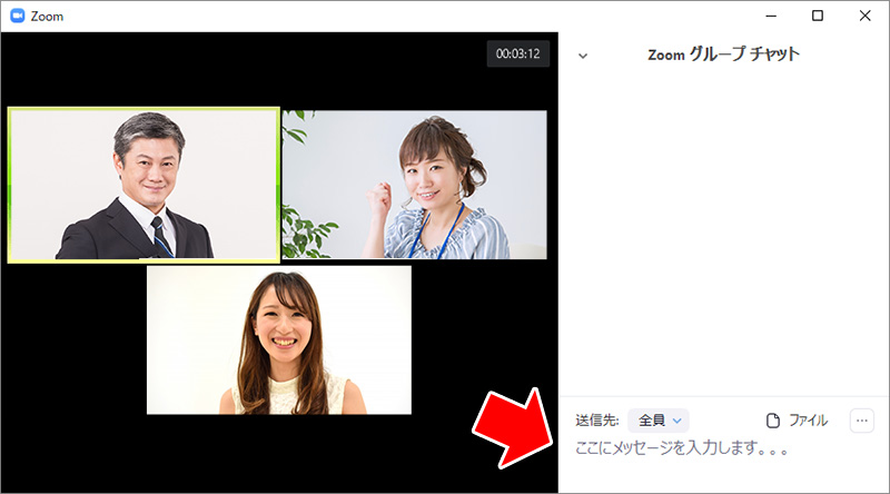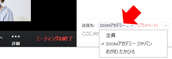 その中から参加者を選択すると「プライベートチャット」として、その参加者だけにメッセージを送ることができます。