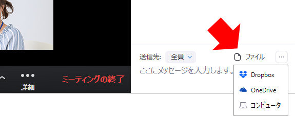 ファイル」ボタンをクリックし、パソコンやクラウドストレージから、ファイルを選択してチャット内でファイルを配布できます。