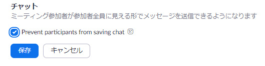 zoom.us の「設定」で、「Prevent participants from saving chat(参加者がチャットを保存することを禁止する)」にチェックを付けると、参加者はチャットを保存することができなくなります。