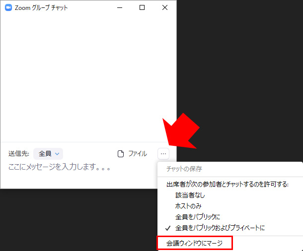 切り離されたチャットのウィンドーをもとに戻すには、「・・・」から、「会議ウィンドウにマージ」をクリックします。