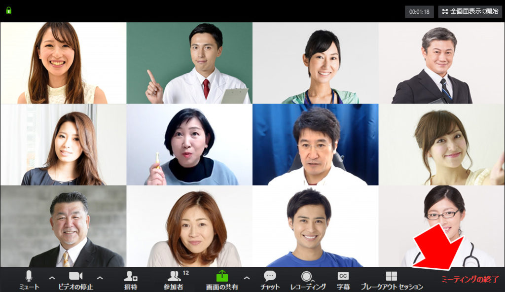 ミーティングを終了するときには、 右下の「ミーティングの終了」をクリックします。