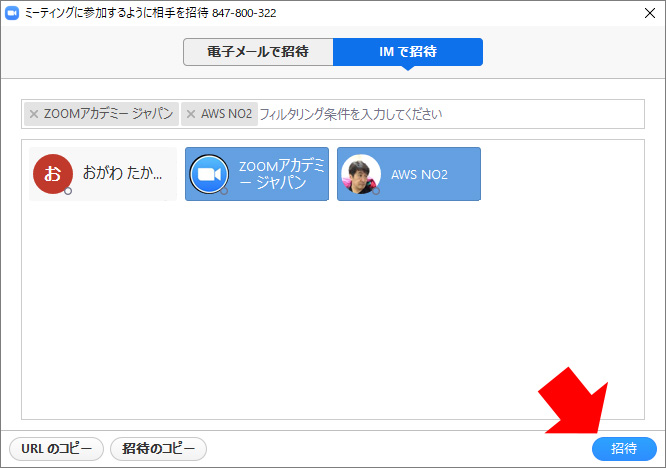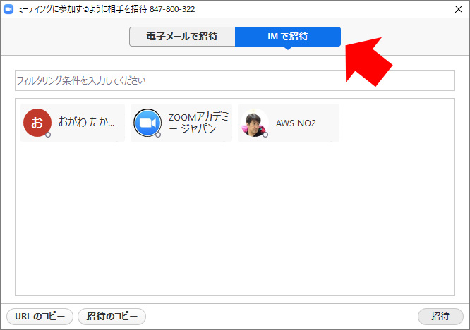 「IMで招待」をクリックすると、Zoomの連絡先に登録されているメンバーが表示されます。