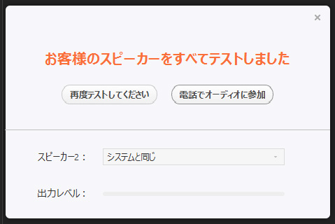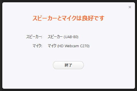 「終了」をjクリックして、スピーカーとマイクのテストを閉じます。