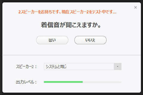 スピーカーのテストで、音楽が聞こえない時は、「いいえ」をクリックすると、2台目のスピーカーがあれば、2台目のスピーカーをテストします。