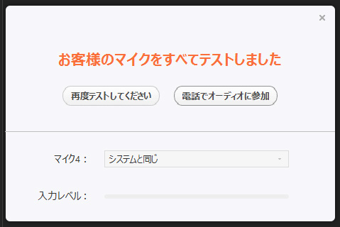 パソコンに接続されているすべてのマイクのテストが終了しても、自分の声がよく聞こえないときは、「再度テストしてください」と「電話でオーディオに参加」という2つのボタンが表示されますが、実際には、Zoomアプリの「オーディオ設定」からマイクの音量を調節してみてください。