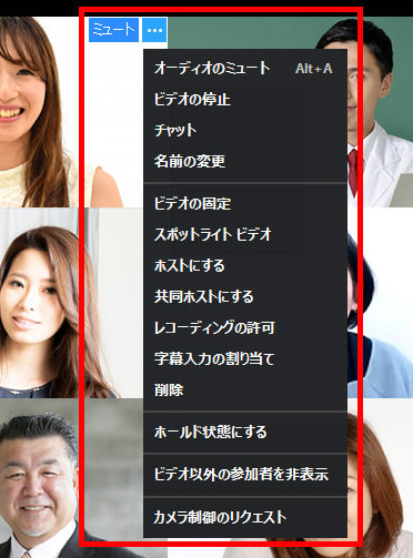 ホストが、各参加者の映っているフレームの中で右クリックするか、右上の をクリックしたときに表示されるメニューには、たくさんの項目があり、これを操作しながらミーティングをコントロールします。