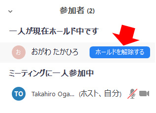 ホールドを解除する」をクリックすることで、保留状態の参加者は、再度ミーティングに入ることができます。