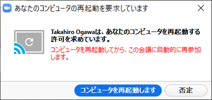 再起動されたパソコンの持ち主は、ミーティングルームに入るまで、操作をせずに待ちましょう。