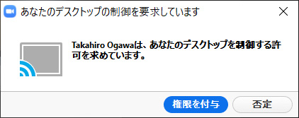 相手のパソコンには、「あなたのデスクトップを制御する許可を求めています。」と表示されます。