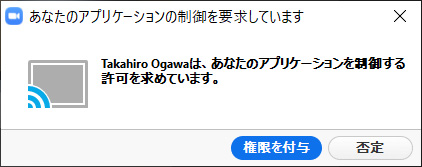 相手のパソコンには、「あなたのアプリケーションを制御する許可を求めています。」と表示されます。