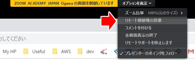 ホストが参加者のリモートサポートを終了したいときには、「リモート制御の放棄」をクリックします。