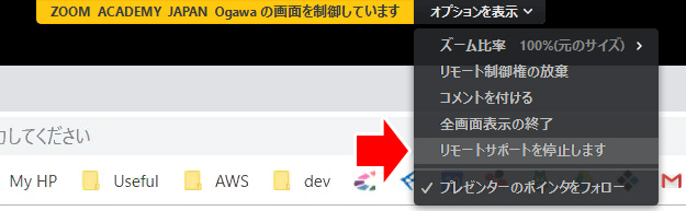 ホストが参加者のリモートサポートを終了し、それと同時に相手の画面共有も終了させたいときには、「リモートサポートを停止します」をクリックします。