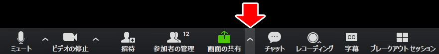 ホストのツールバーには、「画面の共有」の右側の「^」をクリックすると、画面共有時の設定ウィンドーが表示されます。