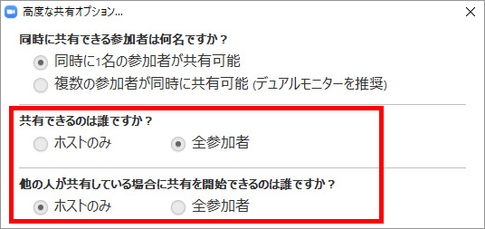 他の人が画面共有している最中に、画面共有を開始できるのをホストに限定します。 - 全参加者
