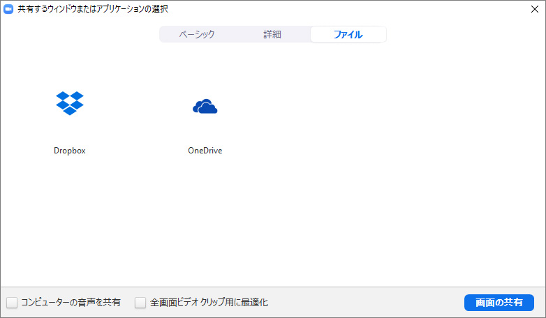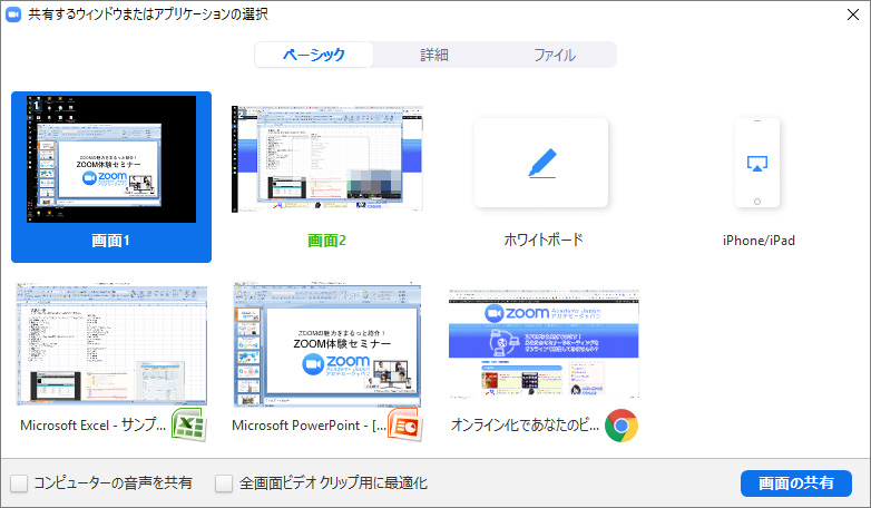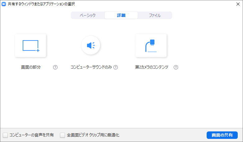 画面の共有をクリックすると最初に表示されるのが「ベーシック」タブです。