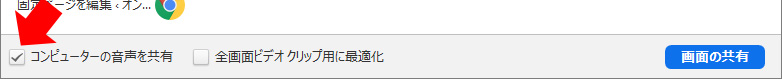 動画データ・音声データ、もしくは音楽などを参加者に聞かせたいときは、「コンピューターの音声を共有」にチェックを入れてください。