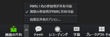 まず、ホストは「画面の共有」の右の「^」をクリックして、「複数の参加者が同時に共有可能」にチェックを付けます。