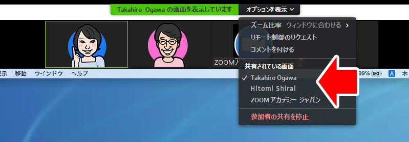 ホスト・参加者に限らず、画面共有していない人は、「オプションの表示」から、共有されている画面を選択して見ることができます。