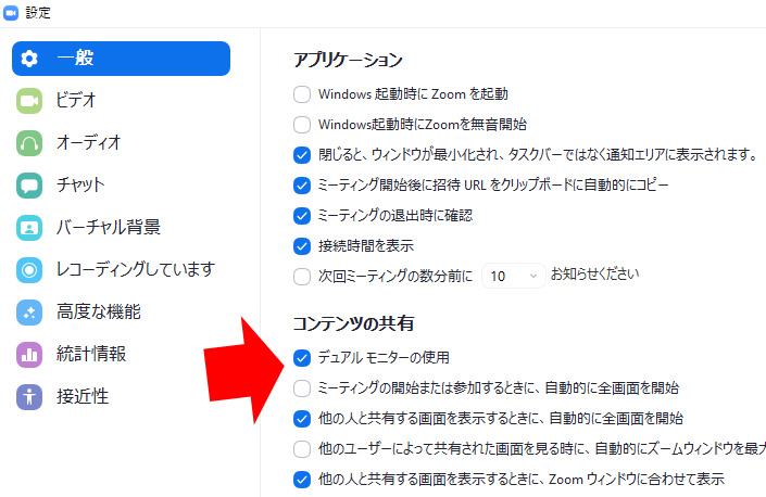 また、ディアルモニター環境では、設定で、「デュアルモニターの使用」にチェックを付けておけば、ふたつのZoomウィンドーで、2つの画面共有が同時に見られます。