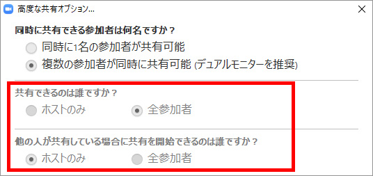 「複数の参加者が同時に共有可能」に設定すると、「共有できるのは誰ですか?」と「他の人が共有している場合に共有を開始できるのは誰ですか?」のオプションは無効になり、全参加者が共有できる状態になります。