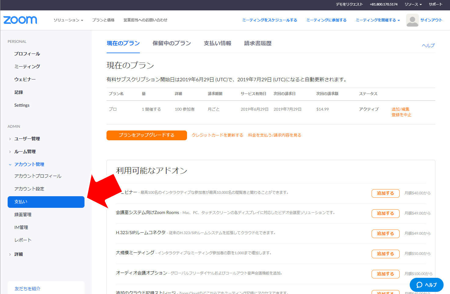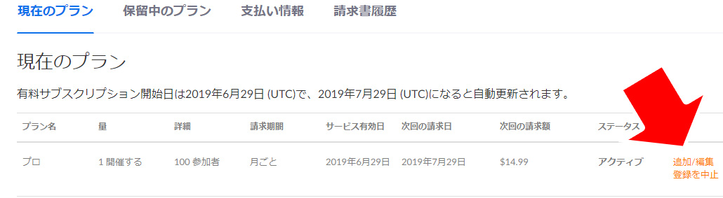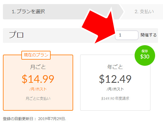 ここでは、支払い方法を変更したり、ホストを増やしたりすることができます。