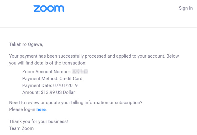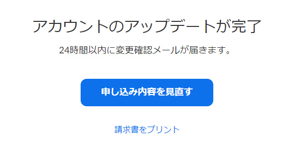「アカウントのアップデートが完了」と表示され、アカウントで使用しているメールアドレスに確認メールが送信されます。