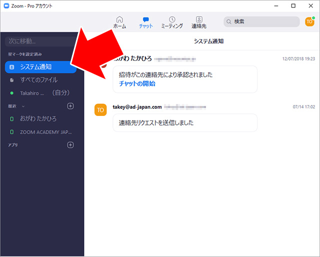 「システム通知」では、メンバーにリクエストを送ったり、メンバーがリクエストを承認した場合などの履歴が残ります。