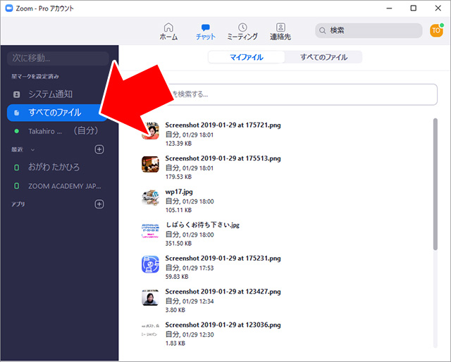 「すべてのファイル」では、このチャット内でやり取りした画像ファイルなど、添付ファイルの履歴が残ります。