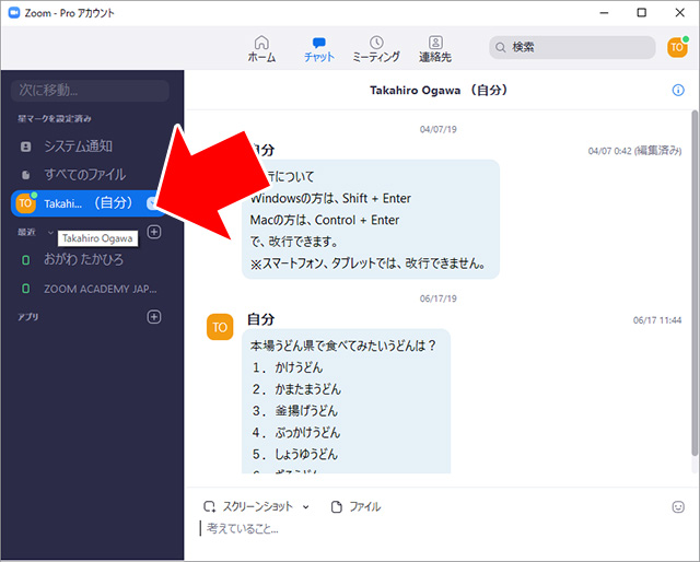 「(自分)」という項目をクリックすると、通常のチャットと同じような表示になっています。