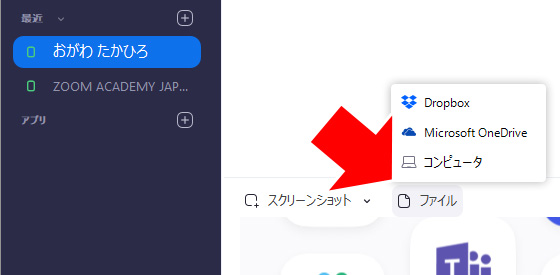 「ホーム」の右にある「チャット」では、Zoomにアカウントを持っているメンバーとチャットをすることができます。