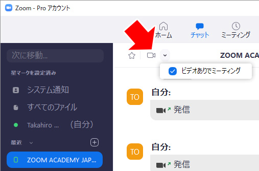 チャットをしている最中に、Zoomミーティングに切り替えたいときは、ビデオのアイコンをクリックします。