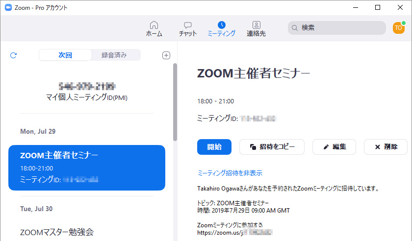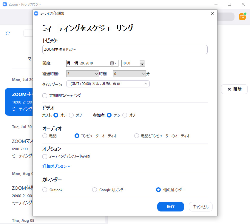 ミーティングの編集ウィンドーが表示され、ミーティングの内容を変更できます。
