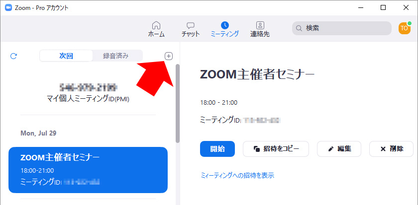 「+」をクリックすることで、新規ミーティングを作成することもできます。