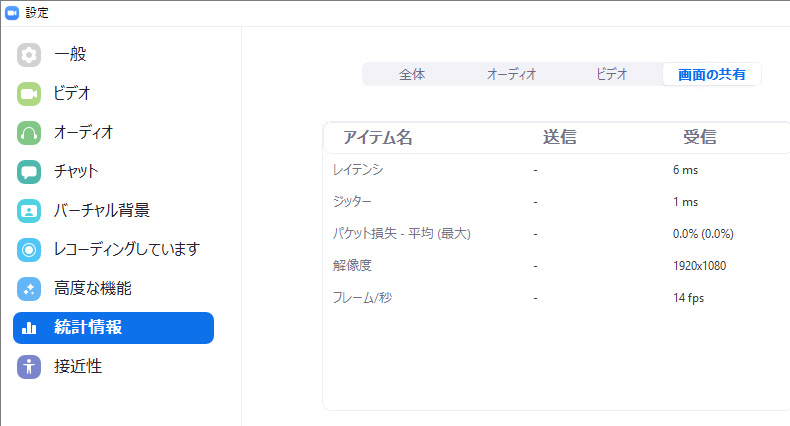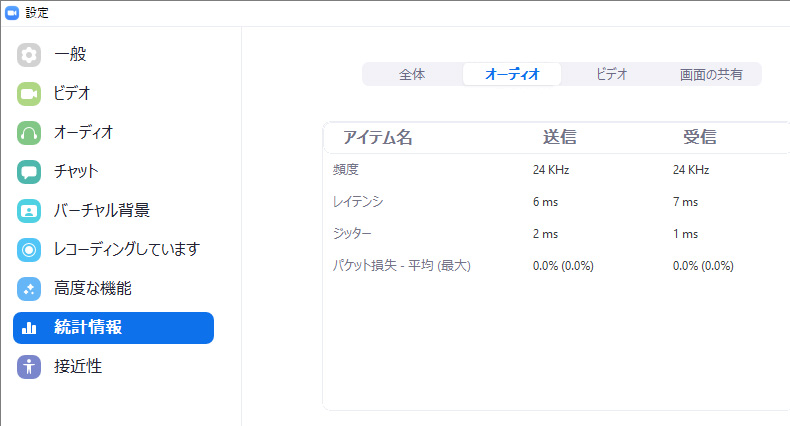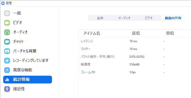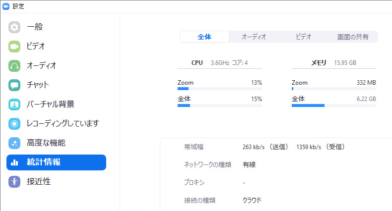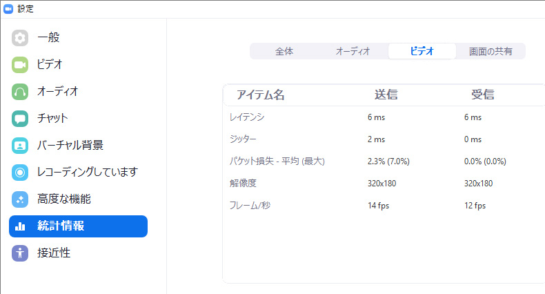 ここでは、Zoomを使っているときのパソコンやネットワークの状況を確認することができます。