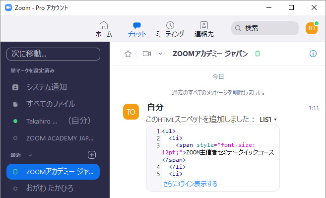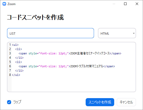 「スニペットを作成」をクリックすると、チャットで見やすくコードのやり取りができます。