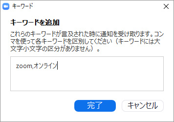 キーワードをコンマ「,」で区切って入力すると、そのキーワードが含まれたメッセージが来たときには、必ず通知されます。