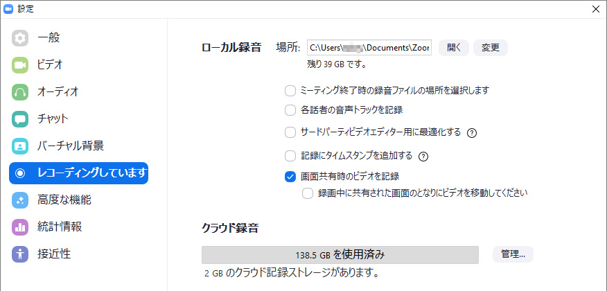 ミーティング終了時の録音ファイルの場所を選択します