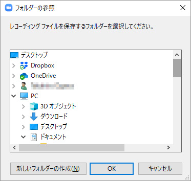 「変更」をクリックして、パソコンの任意のフォルダを選択することで、録画データが作成されるフォルダを変更することができます。
