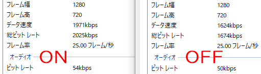 見た目はほとんど変わりませんが、ONにするとビットレートが少し下がります。