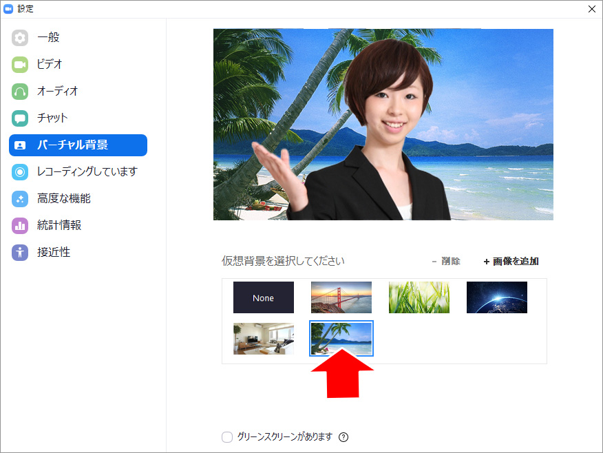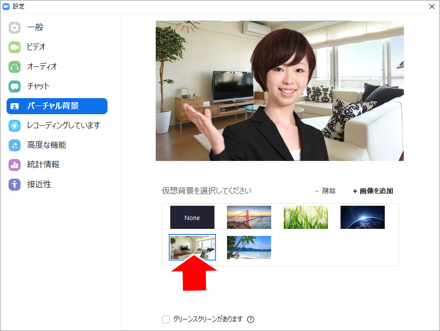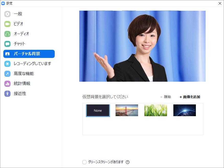 これが、バーチャル背景の設定画面です。