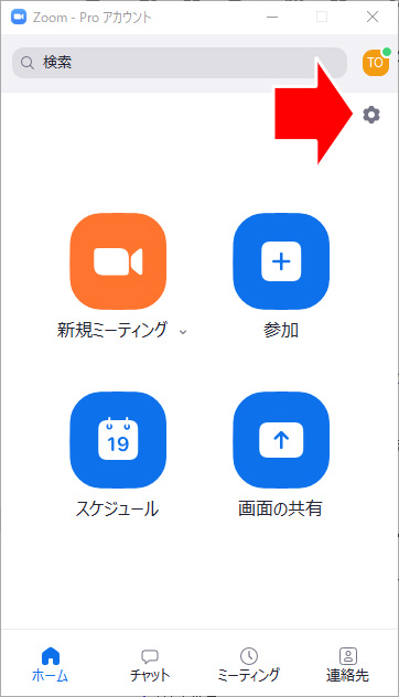 Zoomの起動画面から、バーチャル背景を設定するには、右上にある歯車をクリックして、「バーチャル背景」を選択します。
