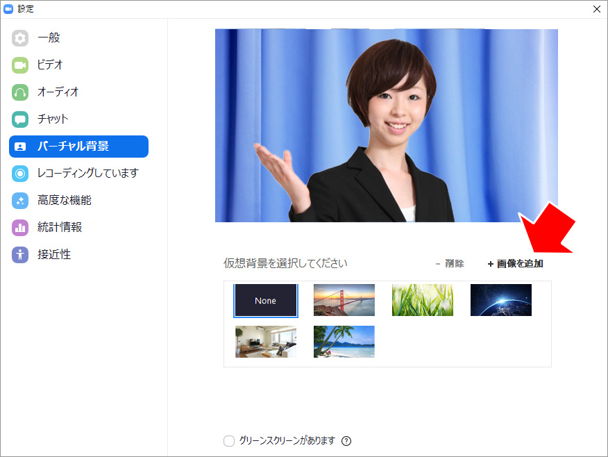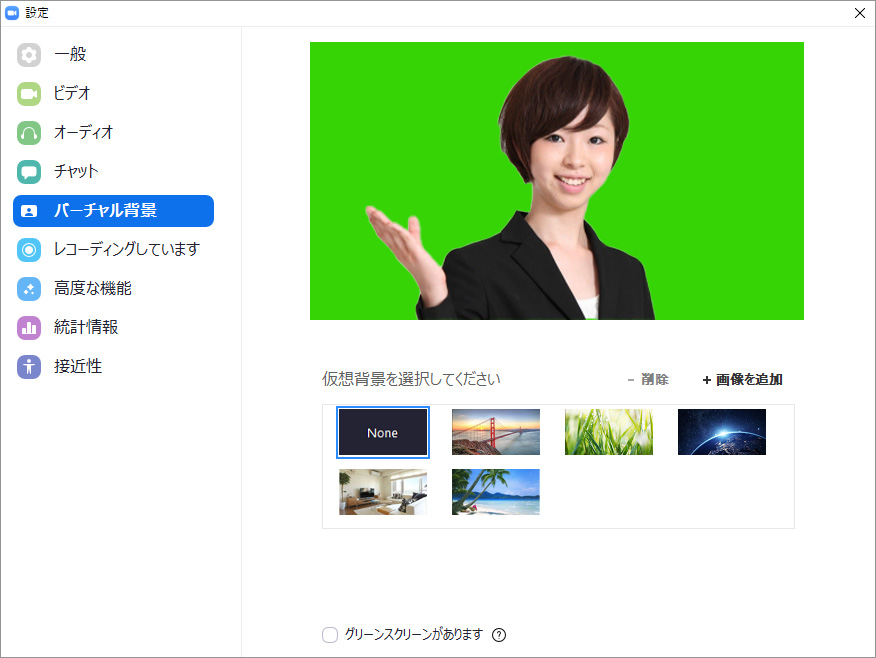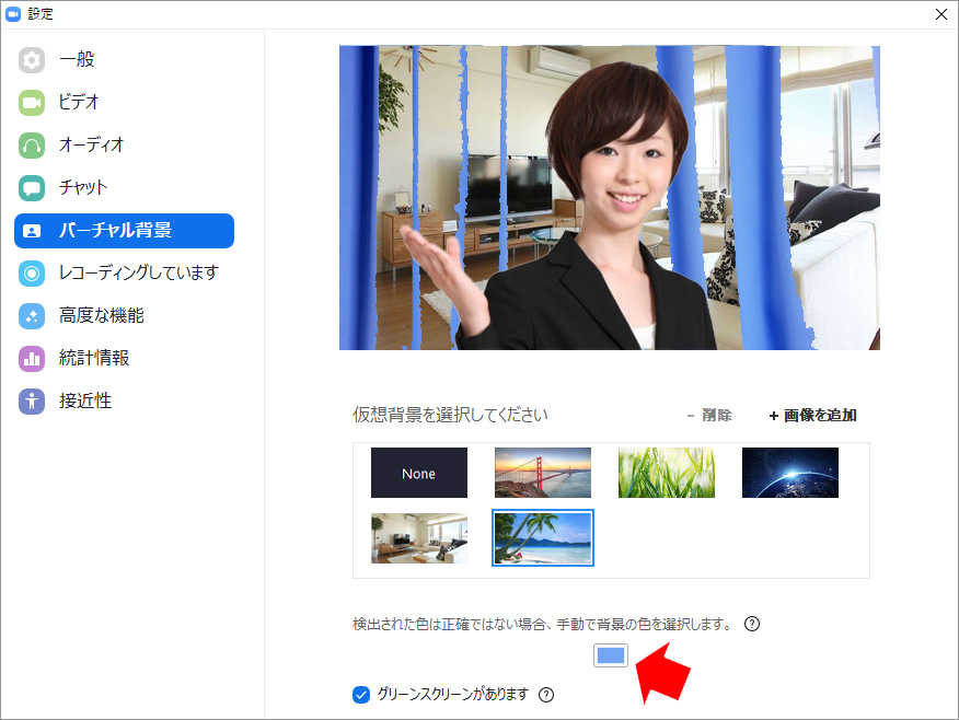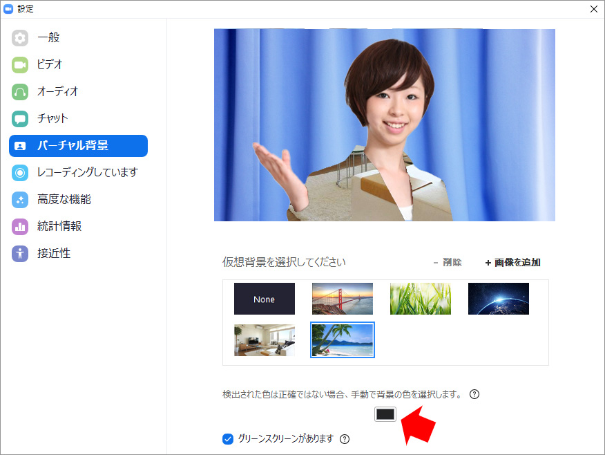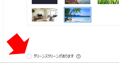 バーチャル背景の設定画面の下に「グリーンスクリーンがあります」というチェックボックスがあります。